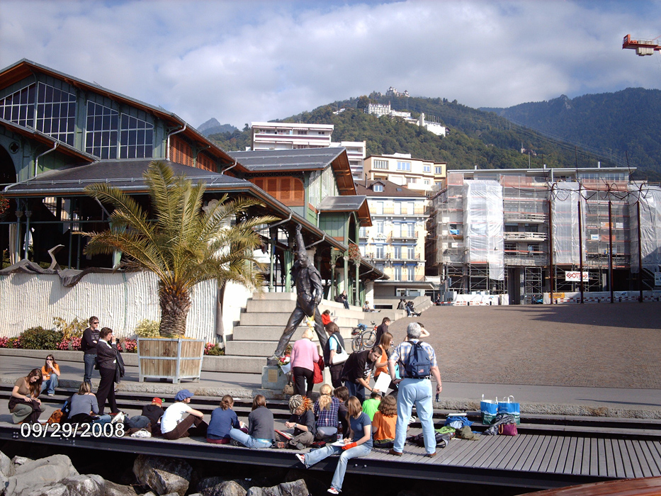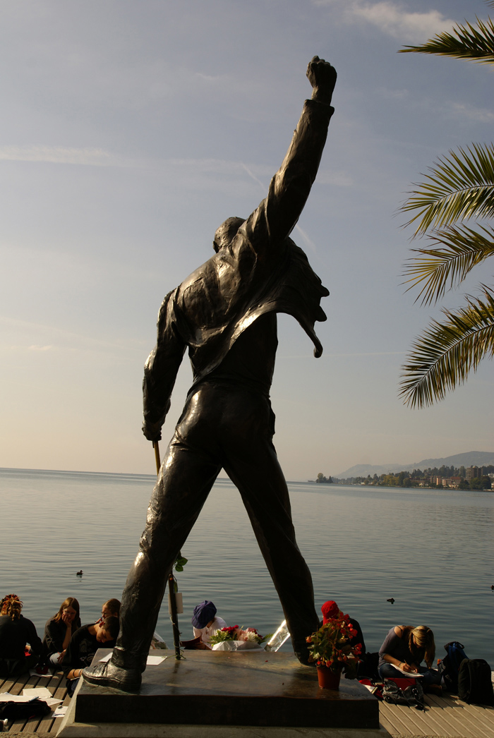 Спустя некоторое время мы, наконец-то, прибыли в Монтрё. Первое, что поразило, так это температура воздуха! Она была значительно выше той, что была, скажем, в Милане. Монтрё так удачно окружен горами, что природа тут просто законсервирована. На набережной растут пальмы, а какие-то местные школьники купяются в женевском озере, прыгая прямо с круглого пирса рядом с памятником Фредди. Другая группа школьников устроила прямо у памятника открытый урок рисования, облажив своими телами почти всё пространство вокруг. Но мы всё-таки прорвались к «железному Фредди» образца 1986 года и сделали несколько кадров с разных ракурсов. Дальше наш путь лежал в магазин Норберта и его семьи – “Suisse Bazar”, где мы, естессно, окупировали ту часть, которая посвящена Queen. Пожалуй, в континентальной Европе нет ни одного магазина, настолько хорошо заполненного всевозможной околокуиновской продуцией. А сколько там было книг, которых у меня не было! Целых 5! Купил все, за исключением немецкой и испанской версий книги “A Life, in His Own Words”. Цены, правда, кусаются. Впрочем, как и во всей Швейцарии.