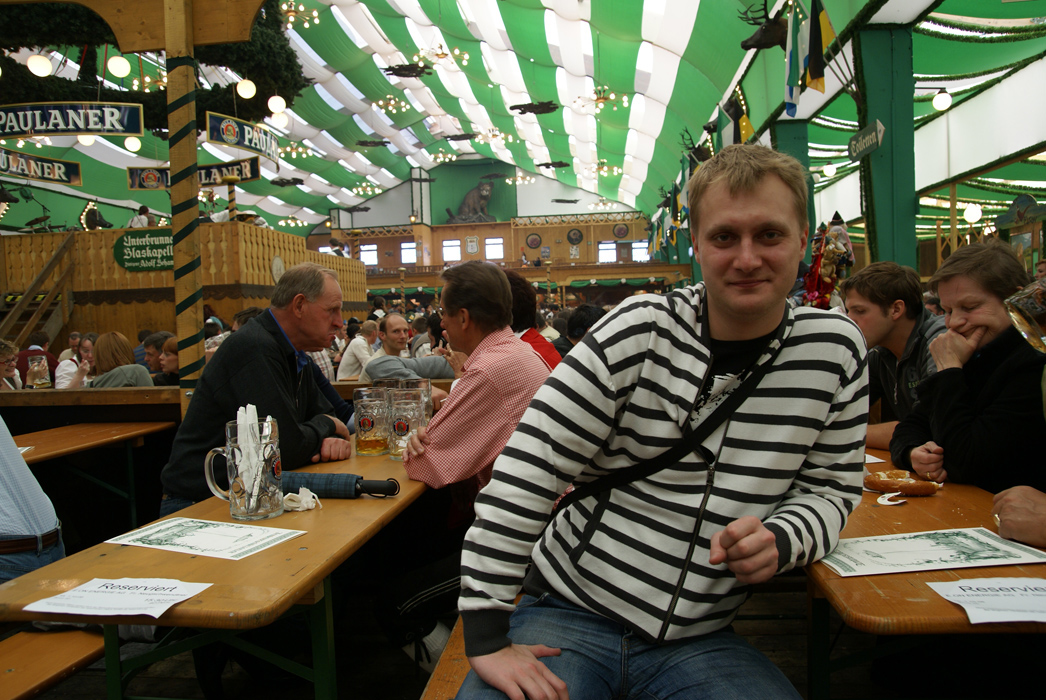 Следующий день был самым интересным… Мы запланировали поход на Октоберфест и поездку в центр города. Но в центр, мы, конечно, не попали потому что так «наоктоберфестились», что нас хватило только на то, чтобы добраться до гостиницы и поспать перед концертом. На поляне, где проходит фестиваль пива, собирается огромное количество людей, все пьют, веселяться, вечером бьют друг другу морды иногда и танцуют на столах. Спустя несколько минут после того как мы вывалились из первой палатки «Паулайнер» Леха умудрился дать интервью местной телекомпании, причём отвечал односложно: “Yes”, “No”, “Beautiful”, “Perfect”, “Das Ist Fantastisch”.