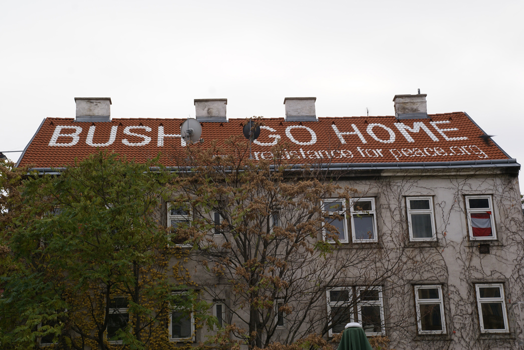 После долгого пути в Вене нас хватило только на распитие спиртных напитков в отеле, даже, несмотря на Helloween в городе было всё мирно и спокойно, казалось, что этот праздник никто не празднует. В Будапеште, кстати, в отношении него подготовка была иной – везде продавались разные зловещие наряды и тыквы с уже прорезанными «стандартными» отверстиями. Основная нагрузка ожидала нас на следующий день, ибо нужно было осмотреть город, смотаться на блошиный рынок на Нашмаркт и встретится с аборигенами с целью выкупа билетов, т.к. я покупал их через eBay у частных лиц. Чем-то особенным в этот день Вена меня не поразила, наверное, только крышей одного из домов с огромной надписью “Bush Go Home” и блошиным рынком, на котором продаётся всякая хрень. Люди просто несут из дома всё подряд, и, раскидав всё это на землю в хаотичном порядке, надеются, что кто-то купит их старые трусы или сломанный радиоприёмник. Были там и продавцы винила и CD. Найти у них что-то интересное – это, наверное, надо весь день там рыться. Один предприниматель продавал номерной винил Queen по 10 евро, хотя красная цена ему – 3-5.